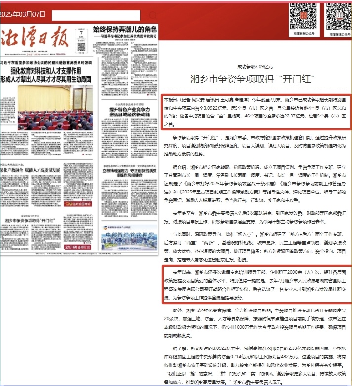 | 2025年3月6日,據(jù)湘潭日?qǐng)?bào)報(bào)道,截至2月末,湘鄉(xiāng)市成功爭(zhēng)取超長(zhǎng)期國(guó)債和中央預(yù)算內(nèi)資金3.092億元,儲(chǔ)備項(xiàng)目資金需求23.37億元,兩項(xiàng)指標(biāo)領(lǐng)跑湘潭市縣區(qū)。湘咨集團(tuán)首創(chuàng)的“專家駐點(diǎn)”政企合作模式成為關(guān)鍵推力。