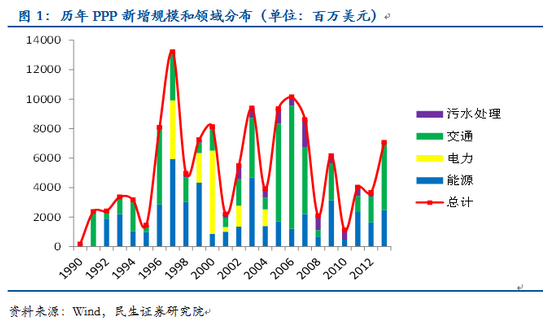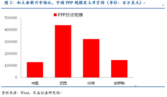 根據(jù)國務(wù)院研究發(fā)展中心的測算,到2020年,與城鎮(zhèn)化相關(guān)的融資需求約為42萬億元。根據(jù)43號文和《地方政府存量債務(wù)納入預(yù)算管理清理甄別辦法》的規(guī)定推演,未來地方政府性債務(wù)主要由一般政府債、專項政府債和PPP債構(gòu)成??梢姡瑧?yīng)對未來幾十年城鎮(zhèn)化的資金缺口,PPP模式被委以了重任。 從43號文規(guī)定來看,對于新增政府債務(wù),推廣使用政府與社會資本合作模式。鼓勵社會資本通過特許經(jīng)營等方式,參與城市基礎(chǔ)設(shè)施等有一定收益的公益性事業(yè)投資和運營。對于存量政府債務(wù),在建工程確實沒有其他建設(shè)資金來源的,應(yīng)主要通過政府與社會資本合作模式和地方政府債券解決后續(xù)融資。 PPP模式具有較大的發(fā)展?jié)摿ΑR环矫妫?013年中國PPP項目的累計總投資為1278億美元,和同類型新興市場比有較大的差距。另一方面,2013年新增的PPP投資額僅為7億美元,而2013年城投債的發(fā)行量則高達9512億元,若PPP模式成功替代城投主導(dǎo)的融資模式,其發(fā)展空間巨大。
