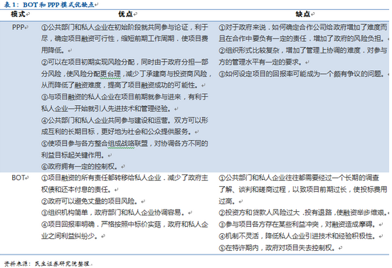 但從合作關(guān)系而言,BOT中政府與企業(yè)更多是垂直關(guān)系,即政府授權(quán)私企獨立建造和經(jīng)營設(shè)施,而不是與政府合作,PPP通過共同出資特殊目的公司更強調(diào)政府與私企利益共享和風(fēng)險分擔(dān)。 PPP的優(yōu)點在于政府能夠分擔(dān)投資風(fēng)險,能夠降低融資難度,雙方合作也能夠協(xié)調(diào)不同利益主體的不同目標,形成社會利益最大化,但缺點在于增加了政府潛在的債務(wù)負擔(dān)。BOT優(yōu)點在于政府最大可能的避免了項目的投資損失,缺點是投資風(fēng)險大,私營資本可能望而卻步,且不同利益主體的利益不同,單方面利益最大化的納什均衡并非全社會最優(yōu)。